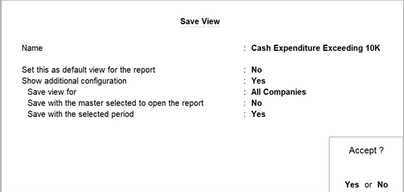 - In the subsequent screen, give the name of the Report template you want to use in the future - e.g., “Cash Expenditure exceeding 10K”