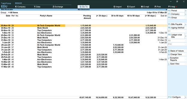 TallyPrime lets you see all the bills receivables in a consolidated fashion.