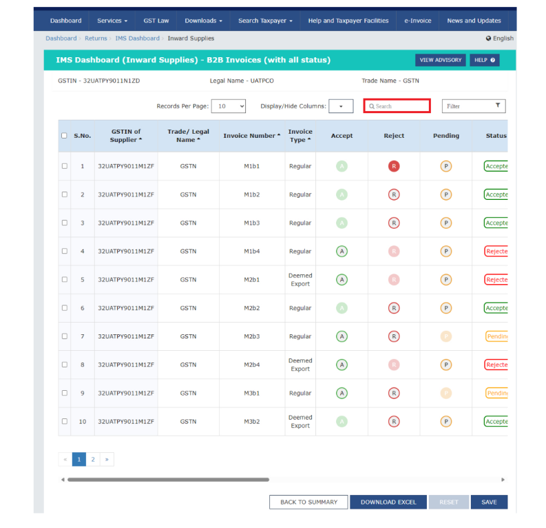 - Pending: These records will not be considered for GSTR-2B generation for the month, same will be carried forward by IMS for further action in subsequent months.